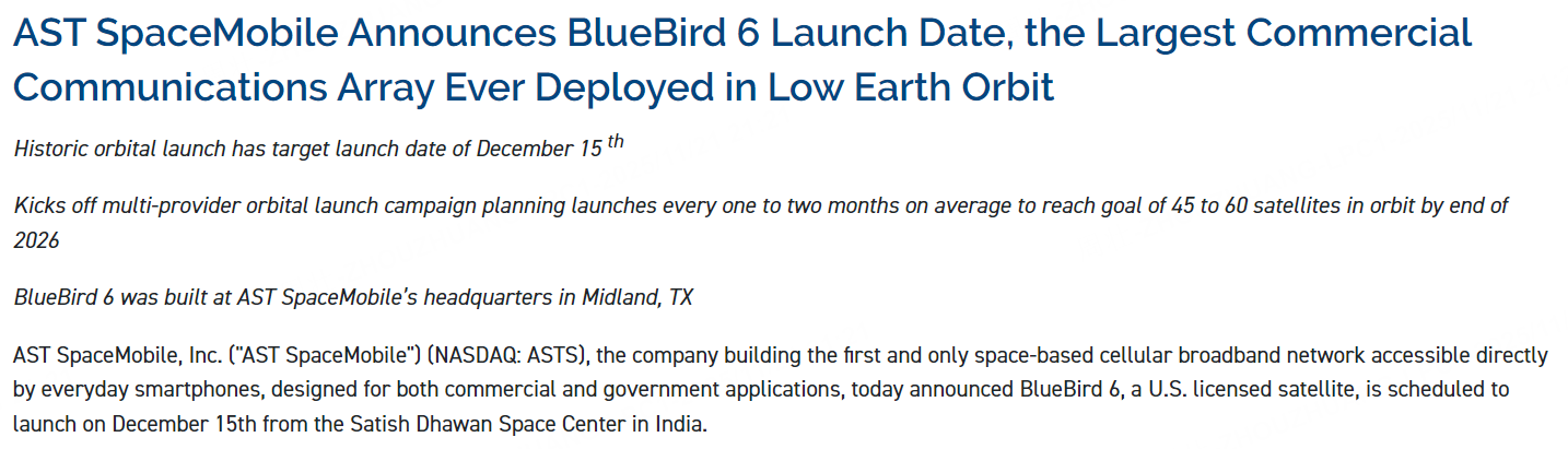AST SpaceMobile宣布BlueBird 6计划于12月15日发射升空