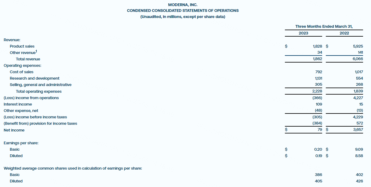 5月4日,Moderna发布2023年一季度业绩。财报显示,第一季度营收18.6亿美元,市场预期11.78亿美元,去年同期60.7亿美元;净利润0.79亿美元,市场预期净亏损6.5亿美元,去年同期净利润37亿美元;每股收益0.19美元,市场预期每股亏损1.798美元,去年同期每股收益8.58美元。