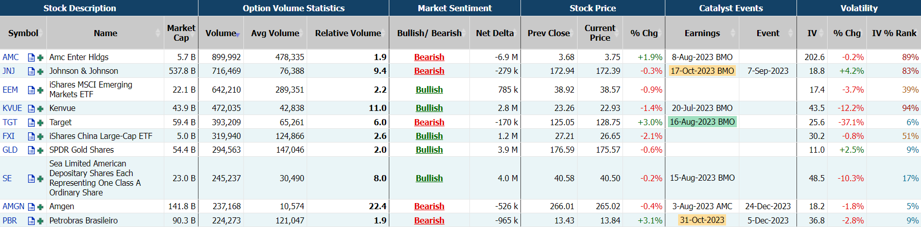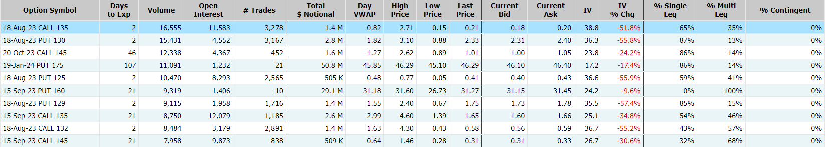 季度利润超出预期,塔吉特隔夜涨近3%,期权合约成交39.3万张,较90日平均成交量扩大6倍。8月18日到期的135美元的行权看涨期权交易量特别高,共有16,555份合约交易。 $TGT 20230818 135.0 CALL$