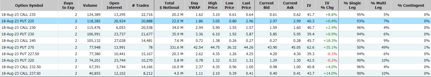 特斯拉8月18日到期的225美元的行权看跌期权交易量特别高,共有118,385份合约交易。 $TSLA 20230818 225.0 PUT$