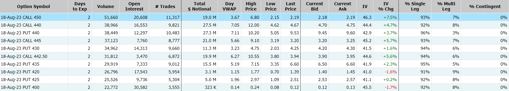 英伟达隔夜跌超1%,期权合约成交100.8万张。8月18日到期的450美元的行权看涨期权交易量特别高,共有51,660份合约交易。 $NVDA 20230818 450.0 CALL$