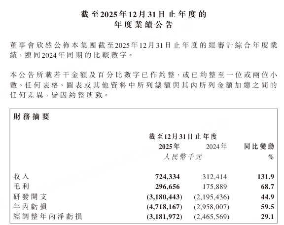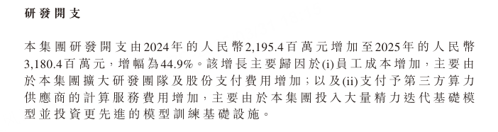 与此同时,公司的销售成本同比增长213.3%,至4.28亿元,与业务扩张的节奏一致。而真正的“烧钱”大头在于研发。2025年,公司研发开支高达31.80亿元,同比增长44.9%,占总收入的439%。