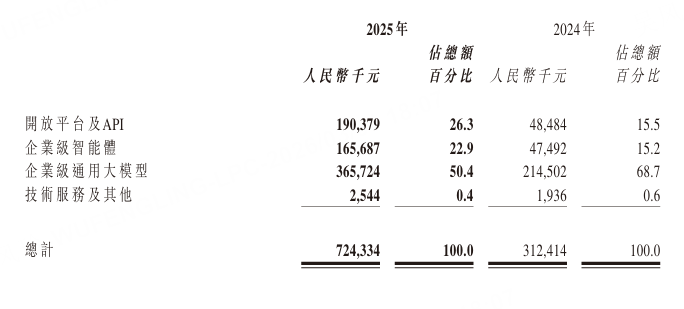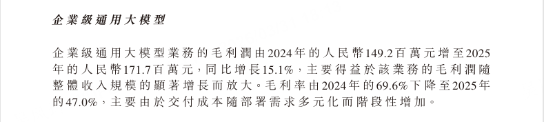 报告期内,公司毛利为2.97亿元,同比增长68.7%。但整体毛利率从2024年的56.3%下降至41.0%。财报解释,这主要由于云端部署业务占比提升,以及本地化部署业务为满足客户需求投入更多交付资源导致毛利率阶段性下降。其中,企业级通用大模型的毛利率从69.6%下降至47.0%,是一个显著的变化。