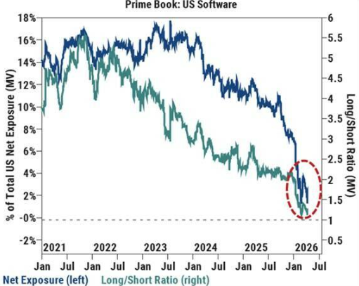 然而,高盛同时警告,AI对软件行业长期利润率和回报率的压制效应并未改变,这一估值层面的压力横跨整个市场,并非软件板块独有。与此同时,对冲基金在软件股上的仓位正重新逼近历史低点,空头力量依然主导市场结构。