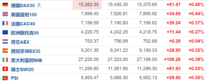 欧洲主要指数集体上涨,德国DAX30涨0.40%,英国富时100涨0.44%,法国CAC40涨0.37%。原油