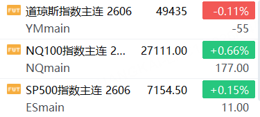 4月24日,美股三大股指期货涨跌不一,截止发稿,道指期货跌0.11%,纳指期货涨0.66%,标普500指数期货涨0.15%。