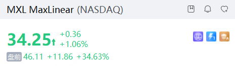 芯片制造商MaxLinear盘前涨超34%,一季度业绩超预期,并上调业绩指引。