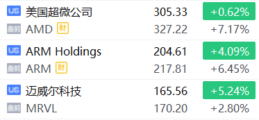 美股半导体股盘前续涨,AMD涨超7%,ARM涨超6%,迈威尔科技涨近3%,月内已累涨超67%股价创新高。