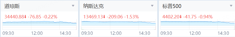 美东时间周三,美股尾盘跳水三大指数集体收跌,此前美联储按兵不动,但暗示利率将在更长时间内保持在较高水平,这令投资者失望不已。截至收盘,道指收跌76.85点,跌幅为0.22%,报34440.88点;纳指跌209.06点,跌幅为1.53%,报13469.13点;标普500指数跌41.75点,跌幅为0.94%,报4402.20点。