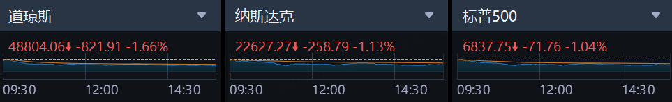 2月24日,美股三大指数集体收跌,截至收盘,道琼斯跌1.66%,报48804.06点;标普500跌1.04%,报6837.75点;纳斯达克跌1.13%,报22627.27点。