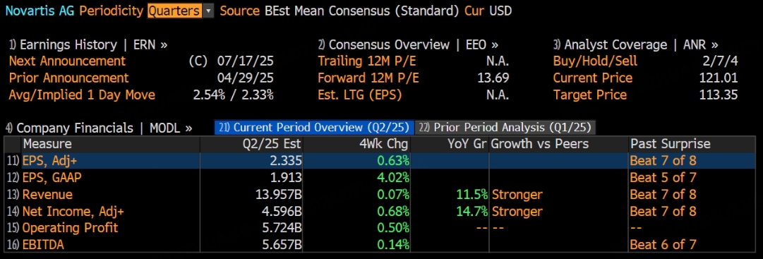 根据彭博分析师预期,诺华第二季度营收为139.57亿美元,调整后净利润为45.96亿美元,调整后EPS为2.34美元。