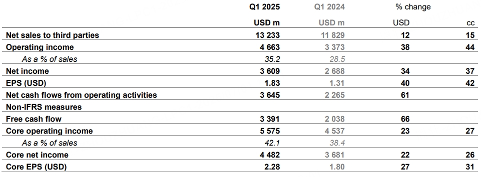 上季度诺华公司实现收入约132亿美元,相较去年同期增长约15%,核心运营利润率接近42%,净利润和净利率也在上一年基础上稳步抬升,调整后每股收益达1.83美元,同比涨幅约40%。