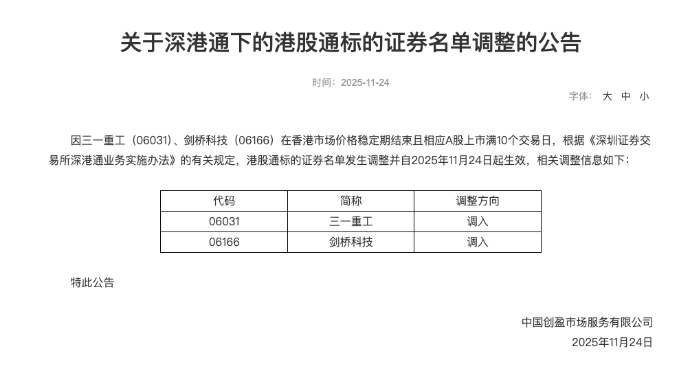 因三一重工、剑桥科技在香港市场价格稳定期结束且相应A股上市满10个交易日,根据《深圳证券交易所深港通业务实施办法》的有关规定,港股通标的证券名单发生调整并自2025年11月24日起生效。