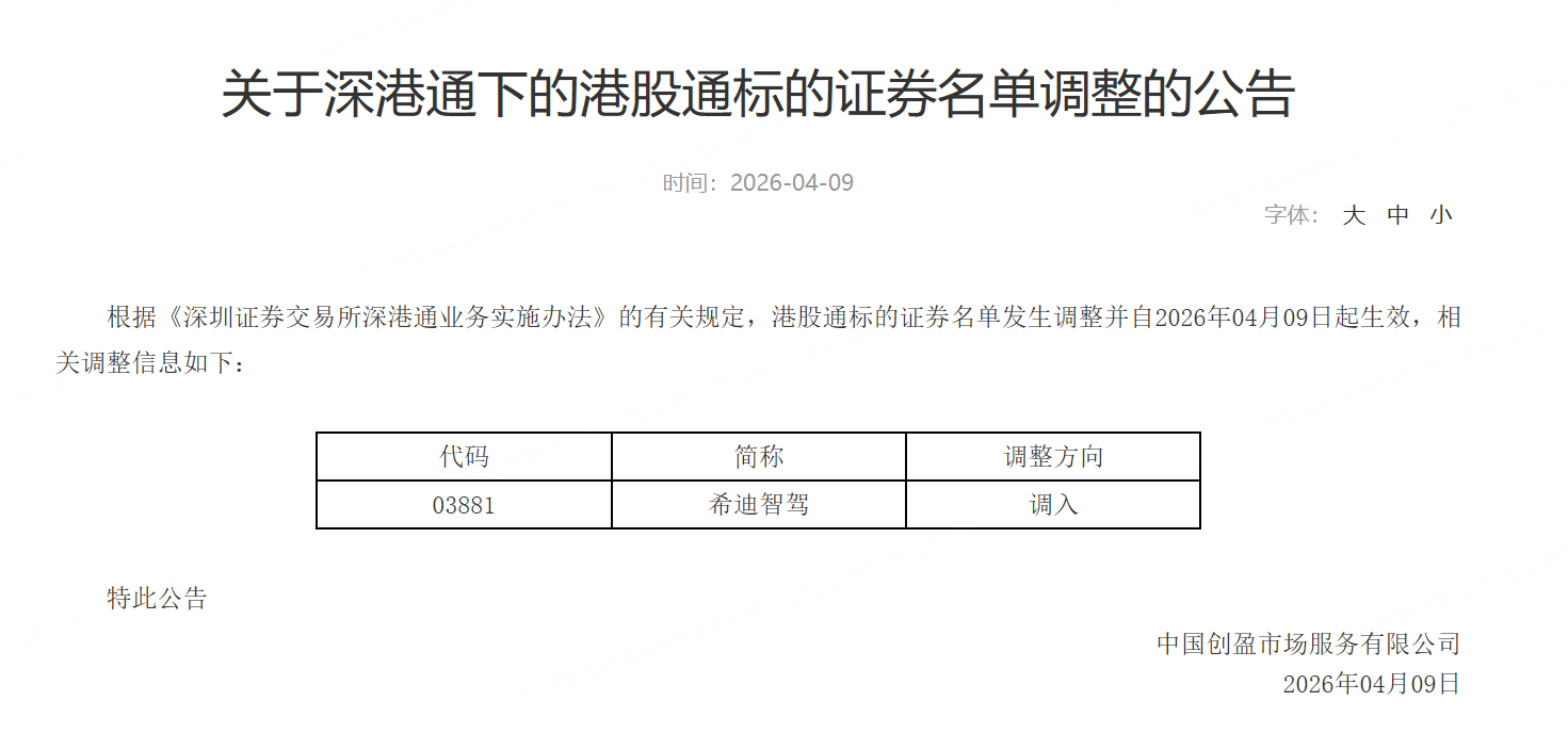 深交所公告,根据《深圳证券交易所深港通业务实施办法》的有关规定,港股通标的证券名单调入希迪智驾,自2026年04月09日起生效。