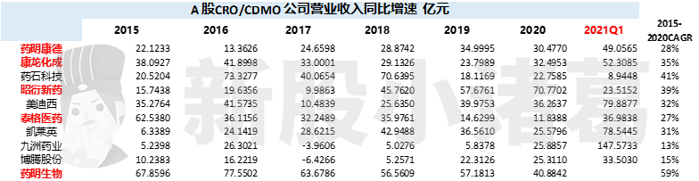 从上图中我们可以看到,整个中国上市公司中,所有的公司增速都是非常的亮眼,2015-2020的营业收入CAGR都达到了惊人的20-30%,甚至药石科技达到了40%,药明生物达到了59%,这都是行业中的佼佼者,那么我们就知道,在2015-2020年的这个环节中,CAGR增长20-30%是正常水平。
