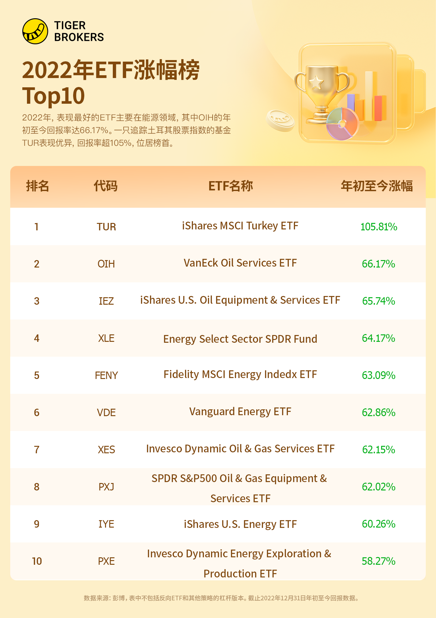 2022年,表现最好的ETF主要在能源领域,其中OIH的年初至今回报率为66.17%。一只追踪土耳其股票指数的基金TUR表现优异,回报率超过105%,位列涨幅榜榜首。