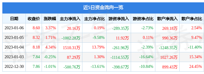 1月6日的资金流向数据方面,主力资金净流入20.16万元,占总成交额0.19%,游资资金净流出289.35万元,占总成交额2.73%,散户资金净流入269.18万元,占总成交额2.54%。