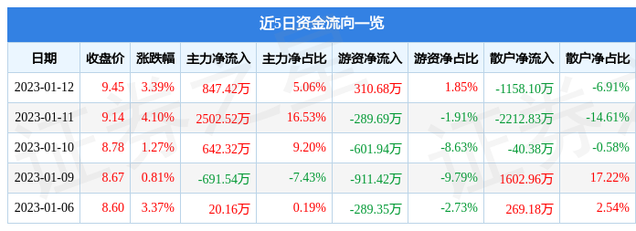 1月12日的资金流向数据方面,主力资金净流入847.42万元,占总成交额5.06%,游资资金净流入310.68万元,占总成交额1.85%,散户资金净流出1158.1万元,占总成交额6.91%。