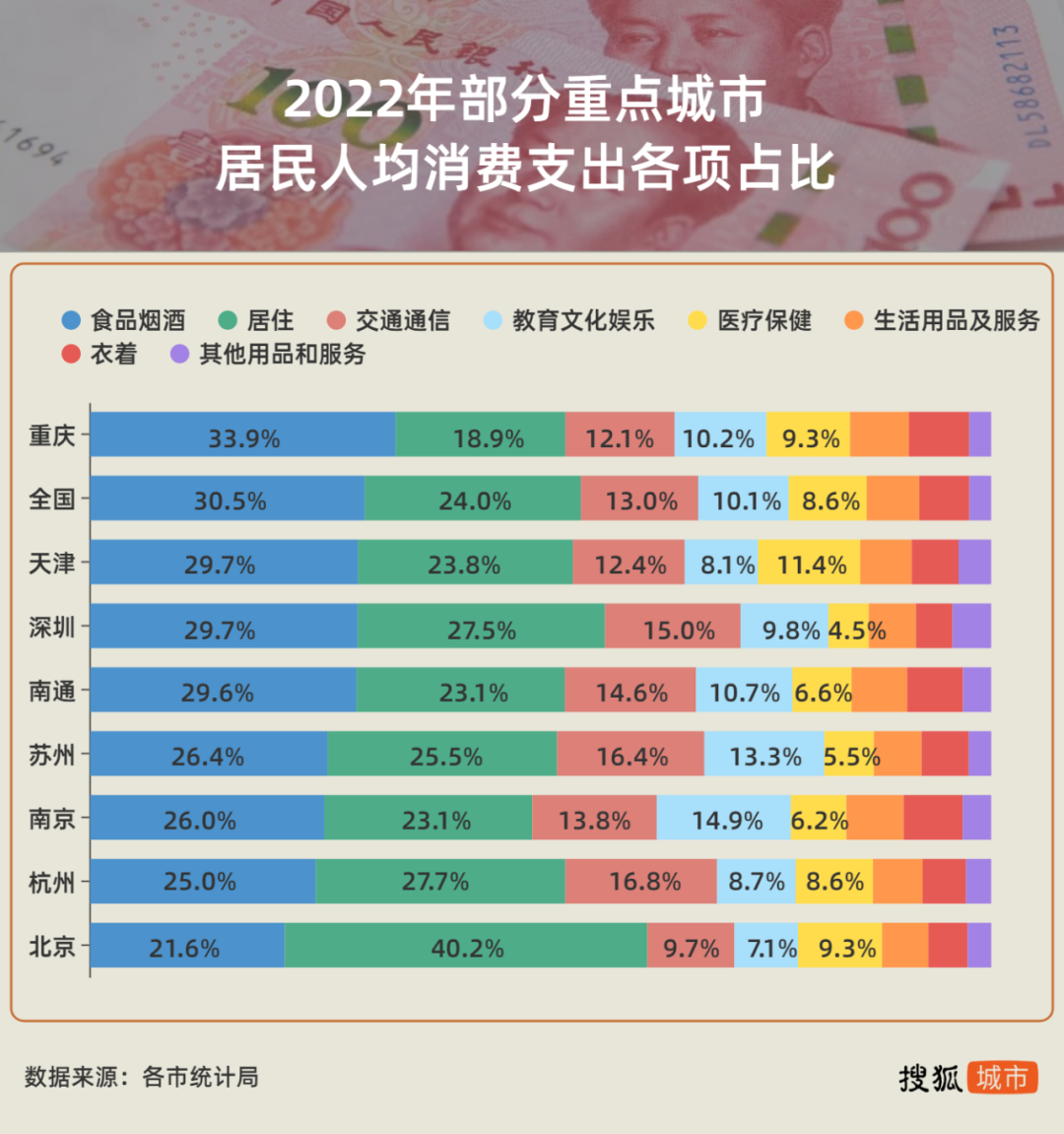 与重庆完全相反的是北京,食品烟酒消费仅占全部支出的21.6%,居住支出却高达40.2%。作为全国房价最高的城市之一,北京人均居住支出达到17170元,帝都居大不易,诚不我欺。当然,深圳(12296元)、杭州(12864)、苏州(10918)等房价较高的城市,居住支出占比也普遍较高,都超过了25%。