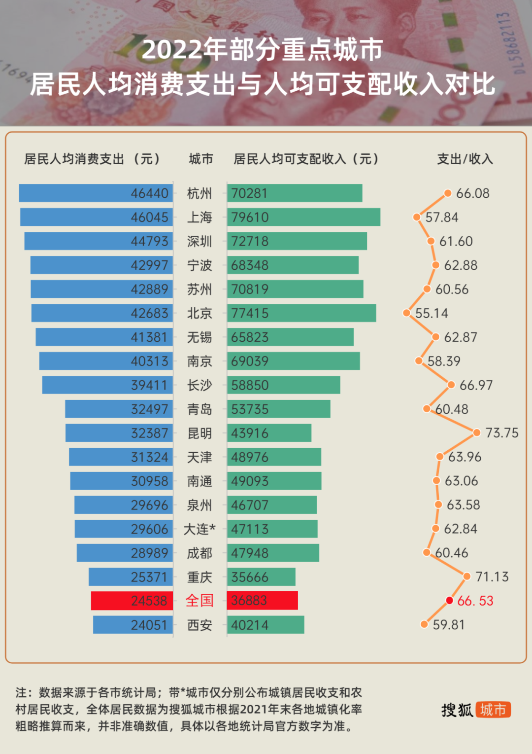 2022年,全国居民人均消费支出占人均可支配收入的比重为66.53%。也就是说,人们赚到100块钱,会拿出66.53块钱用于消费。18座重点城市中,高于这一比重的仅有昆明、重庆和长沙,分别达到73.75%、71.13%和66.97%。