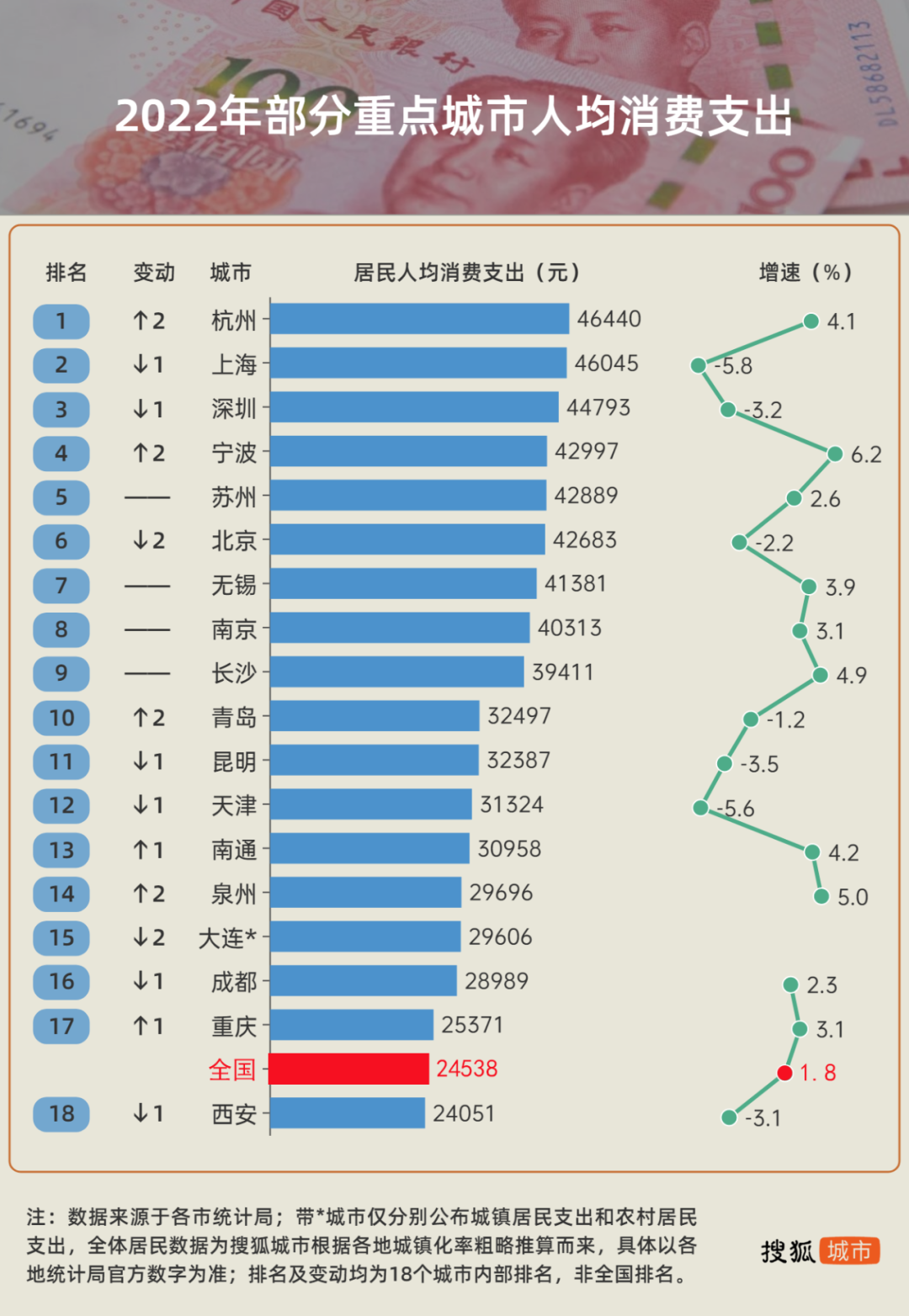 重点城市的表现也不理想。搜狐城市梳理了18座重点城市(包括已公布数据的直辖市、副省级城市、省会城市和万亿GDP城市)居民人均消费支出情况,发现有近半城市人均消费支出负增长,城市排行迎来大洗牌。