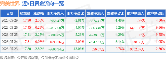 截至2023年5月29日收盘,完美世界(002624)报收于17.9元,上涨2.58%,换手率7.72%,成交量141.03万手,成交额24.75亿元。