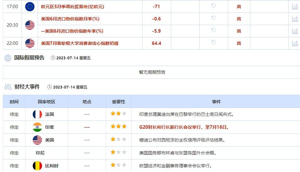 7月14日(周五)关键字:银行股集体发布财报;美国7月密歇根大学消费者信心指数;G20财长和行长副行长会议;