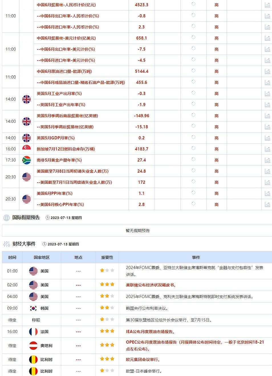 7月13日(周四)关键字:美国PPI数据;美国截至7月8日当周初请失业金人数,美联储经济状况褐皮书;巨星传奇将登陆港交所;