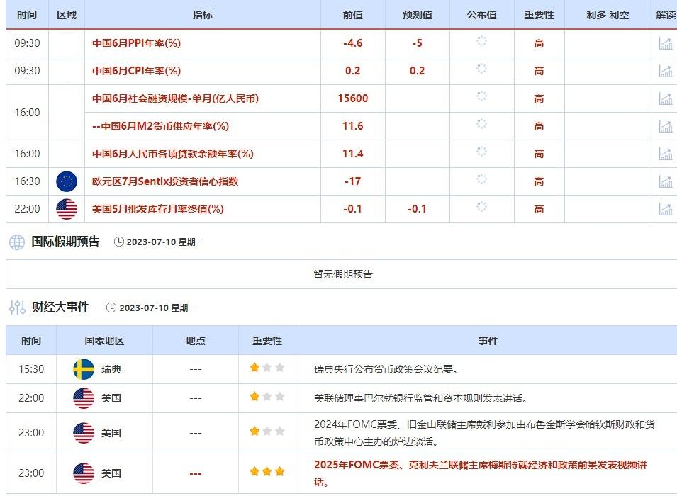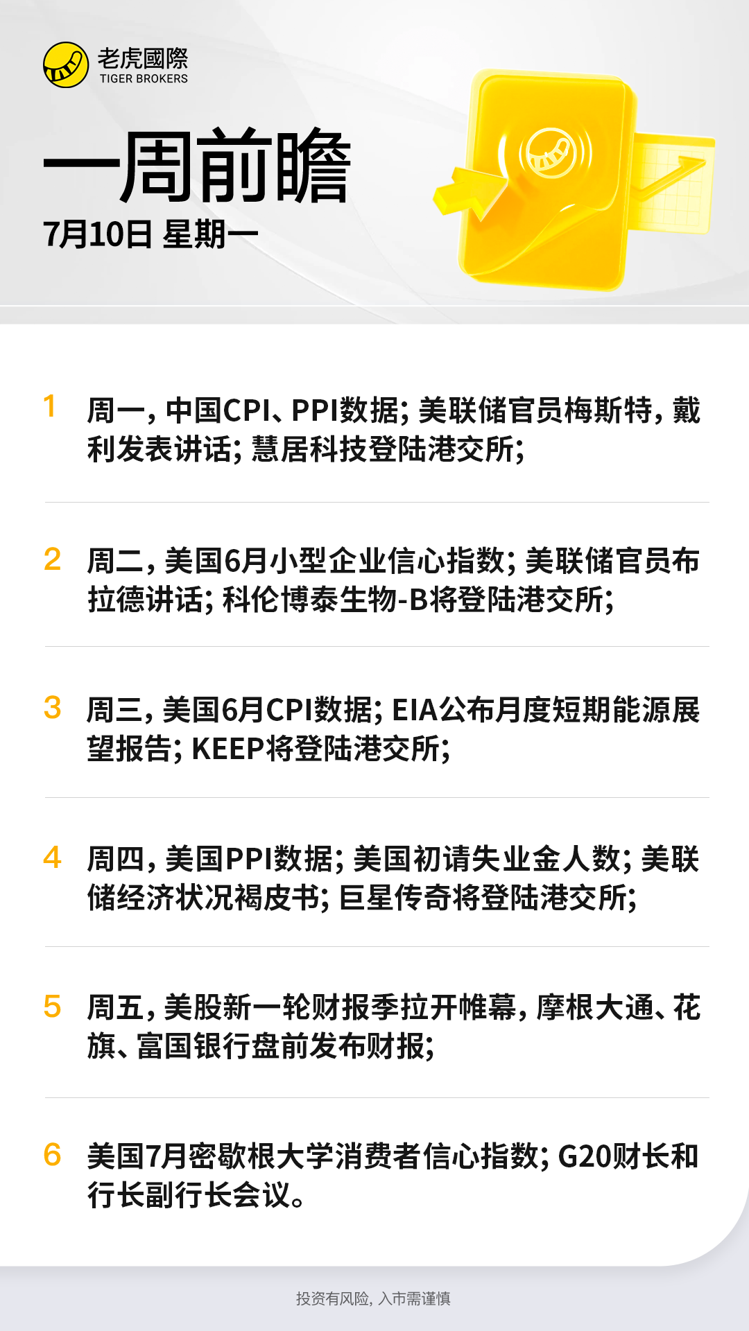 7月10日(周一)关键字:中国CPI、PPI数据;克利夫兰联储主席梅斯特,旧金山联储主席戴利发表讲话;慧居科技登陆港交所;