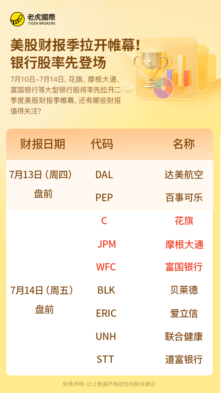 财报方面:摩根大通、富国银行、花旗、贝莱德等银行巨头将发布新一季财报;