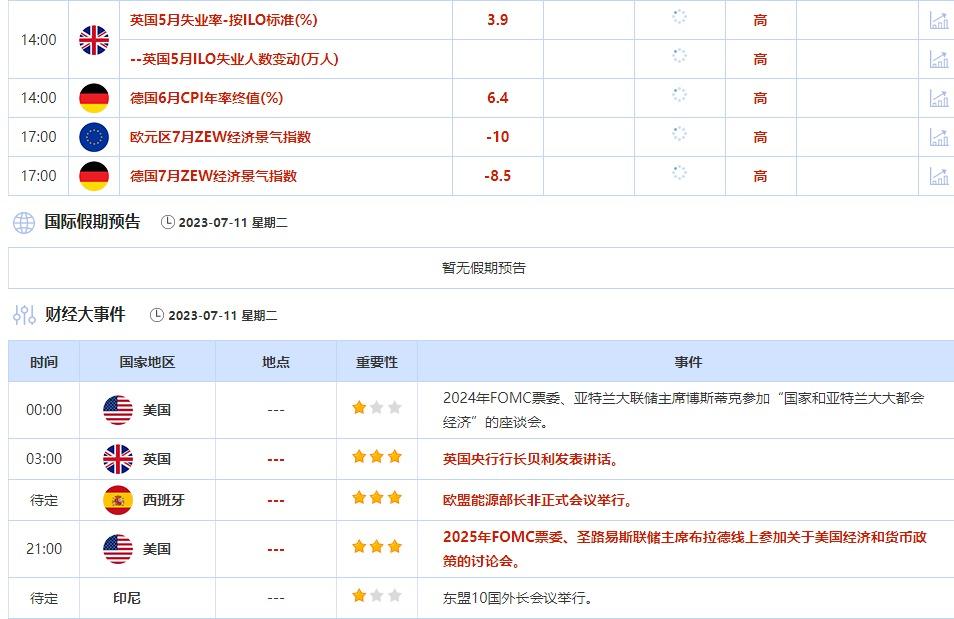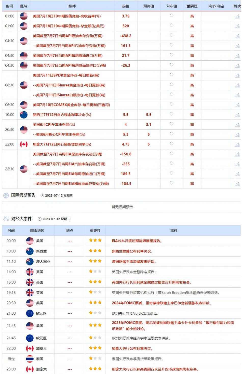 财经事件方面:美联储将经济状况褐皮书,投资者可以从中了解美国经济情况,需引起重视。此外,当天IEA公布月度原油市场报告, OPEC公布月度原油市场报告,可能影响油价。此外,7月13日,欧元集团会议将开始举行,也是需要关注的大事。
