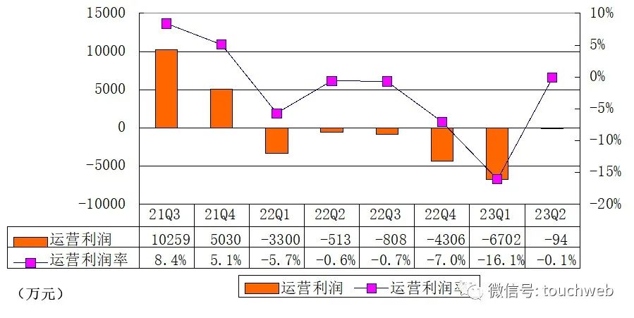 小牛电动2023年第二季度运营亏损为94万元,运营利润率为-0.1%。