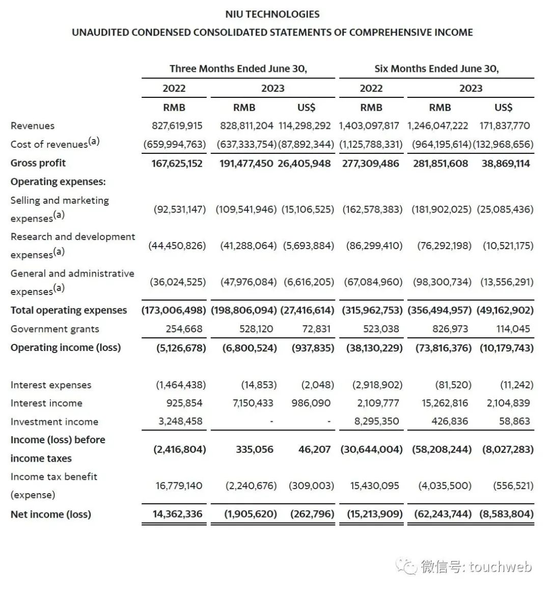 不按美国通用会计准则(non-GAAP),小牛电动2023年第二季度调整后的净利润为1440万元,上年同期净利润为3120万元;净利润率为1.7%,而上年同期净利润率为3.8%。