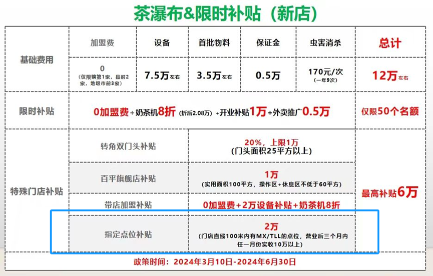 茶瀑布对加盟商有“指定点位补贴”,即对于茶瀑布门店直线100米内有蜜雪冰城或甜啦啦的点位,在营业后三个月内任意一个月实收10万以上,则可以获得2万的补贴。