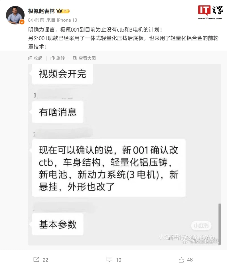 ( IT 之家、微博 )极氪智能科技副总裁赵春林今天在微博发文,对近期 “ 新 001 确认改 CTB / 三电机 ” 传闻进行否认:“ 明确为谣言,极氪 001 到目前为止没有 CTB 和三电机的计划!另外 001 现款已经采用了一体式轻量化压铸后底板,也采用了轻量化铝合金的前轮罩技术!”。