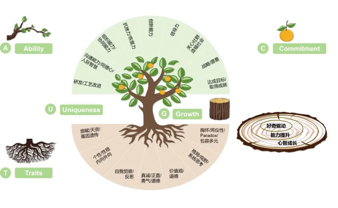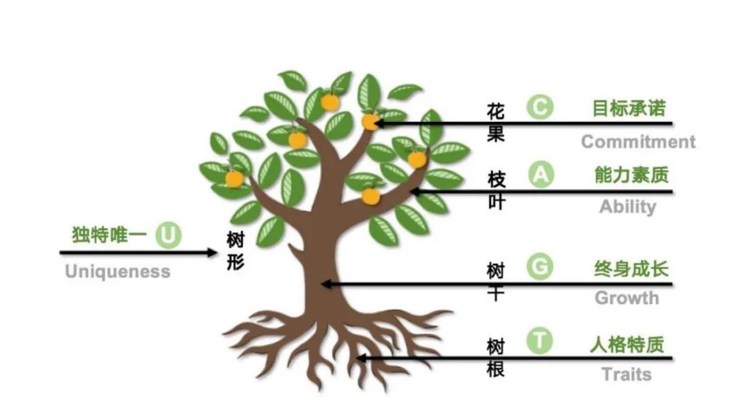 笔者经过研究和联想,提出“大树人才模型”,将人的成长比作树木的生长,从树的各个组成部分——枝叶、花果、树干、树根,以及树形——引申出人才成长的五个基本要素:能力素质(Ability)、目标承诺(Commitment)、人格特质(Traits)、终身成长(Growth) 和独特唯一(Uniqueness)。