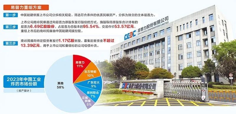 第二步,上市公司南岭民爆通过向易普力原股东发行股份的方式,换股取得原股东合计持有的易普力6.69亿股股份,占易普力总股本的95.54%,交易作价53.57亿元,重组上市后的南岭民爆由中国能建间接控股。