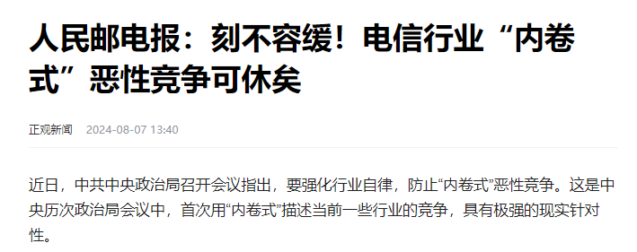比如今年8月,《人民邮电报》就发文称,基础电信企业苦“内卷式”恶性竞争久矣。为了争夺新增用户,不少基层企业出现恶性价格战、策反用户、诋毁竞争对手等行为,同时竞争手段不断翻新,屡禁不止。