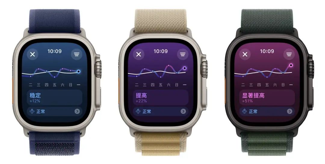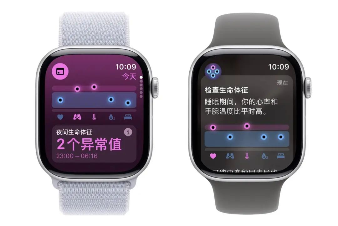 正如健身功能走向“教练化”,Apple Watch 的健康功能也向“私人医生化”迈进:在 watchOS11 上,苹果新增的“生命体征”,第一次结合了多个指标给出趋势分析。用户面对的不再是睡眠时长、心率、体温这些冷冰冰的数字,而是一目了然身体各项指标是否偏离正常。