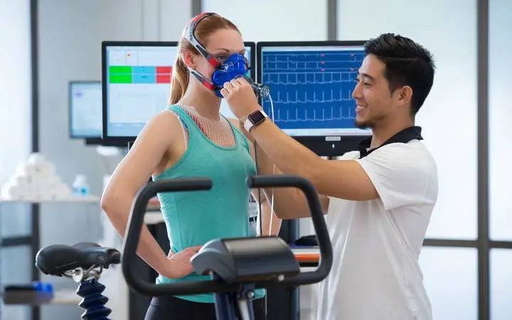 爱范儿曾参观过苹果的健康实验室(Apple Fitness Lab),实验室里每个运动的人都戴着一台蓝色的呼吸面罩。据苹果健身技术副总裁 Jay Blahnik 透露,这是一种用于精确计算运动过程中氧气消耗量的代谢监测仪(metabolic cart),是计算卡路里最准确的方式。