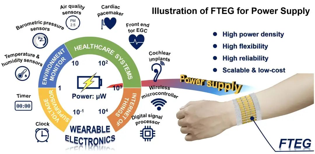 来自哈尔滨工业大学的科研小组开发了一种“柔性热电发电机”(FTEG),该装置可以将人体皮肤散发的热量,即体温,转化为电能,且能实时为 LED 灯供电。这项技术不需要额外配备电池,是真正意义上的“皮肤供电”。
