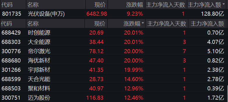 光伏板块表现最为活跃,光伏设备行业指数大涨9.23%,光伏玻璃、光伏屋顶、硅能源、钙钛矿电池、HJT电池等众多概念集体大涨,涨幅均在5%以上,同享科技、艾能聚、大全能源等近20股午间收盘涨停,主力资金净流入光伏设备板块超百亿元。