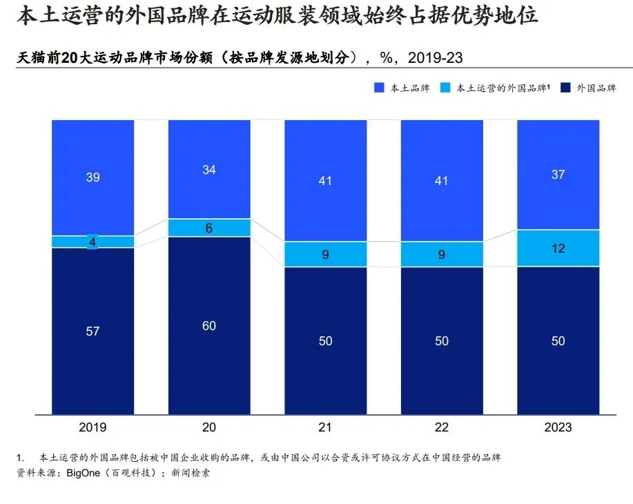 看数据,以运动服装品牌为例。从2019到2023年,虽然“外资品牌”的市场份额有波动,但其中,“本土运营的外国品牌”的市场份额却一路从4%激增3倍,增长到了12%。