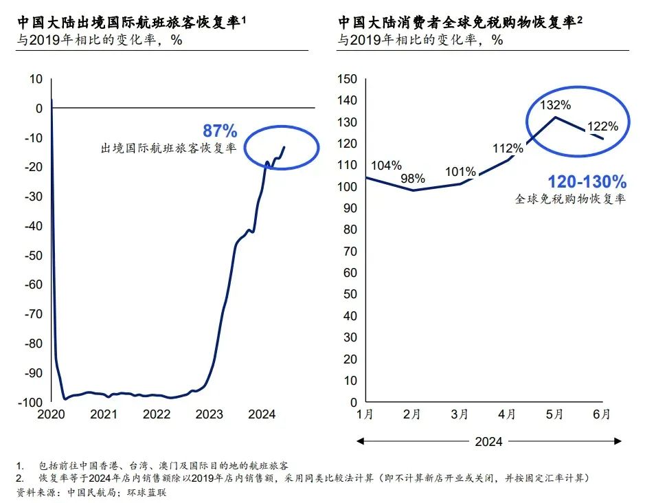 抛开国内的销售额不看,2024年上半年,中国大陆出境国际航班旅客的恢复率,是87%。全球免税购物的恢复率,已经到达了120-130%。