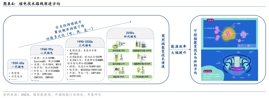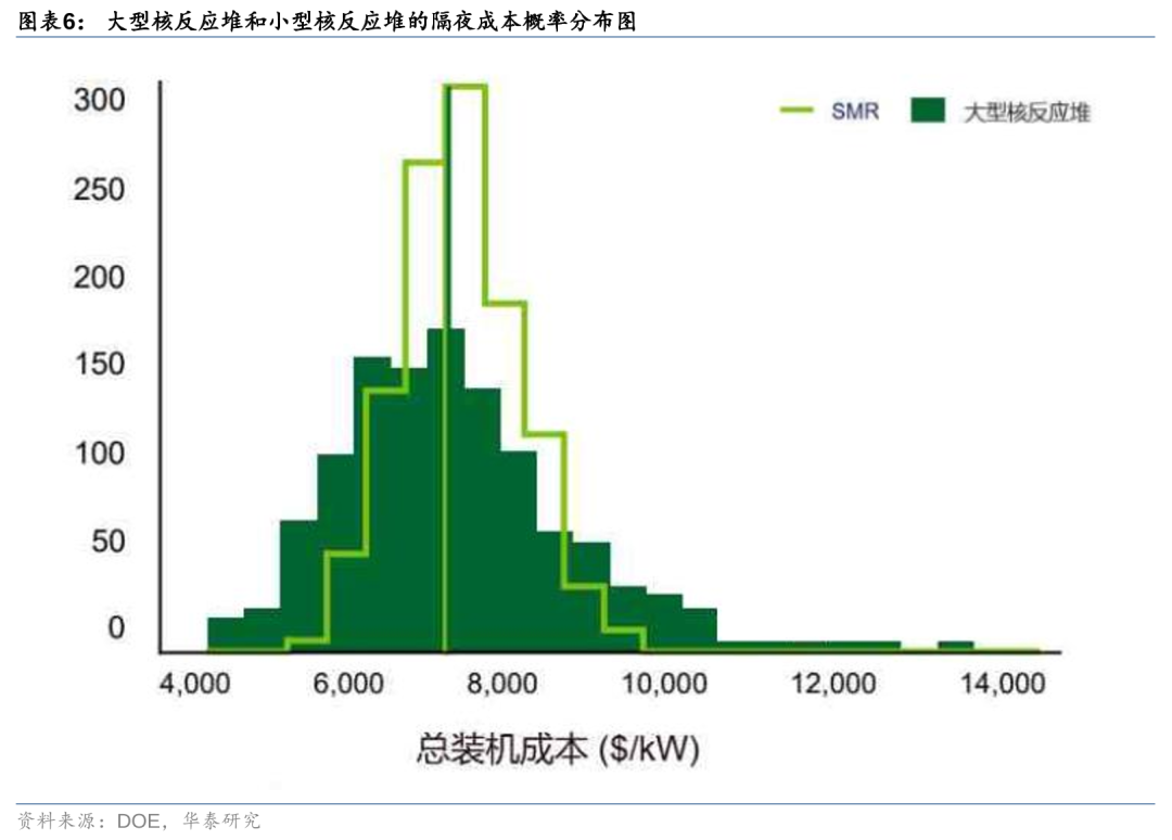 而在美国以外,如在中国等大型核电工程能力更为成熟地区,SMR或更多以多元化应用作为补充的技术形式存在。相比较而言,我国大型核电站工程能力成熟、成本可控,按目前我国沿海地区已选定核电厂址约27个、每个厂址最多可开发6~8台核电机组、单台核电机组装机容量约1GW估算,我国沿海核电累计可装机规模约150-200GW,较当前水平至多还有2-3倍的空间。上述计算对应我国沿海厂址储备还能支撑约十年、每年10台(12GW)左右的开发量,我们预计仍将以大型核反应堆技术为主。SMR展现出的更高安全性,以及应用领域的多元性(除电力外,还包括供热、船舶等)或随着我国非沿海核电的开发政策若能在2030年后逐步放松,从而迎来更广阔的发展空间;而在沿海核电基地中,或仍旧以大型反应堆为主、部分基地配套一座SMR为可能的发展形式(如中核集团江苏徐圩基地,一期项目为两台华龙一号搭配一组高温气冷堆在建;华能集团山东石岛湾基地,一期项目为一座高温气冷堆在运并扩建两台华龙一号在建;中核集团海南昌江基地,四座大型核电站在运配套一座三代加SMR在建)。