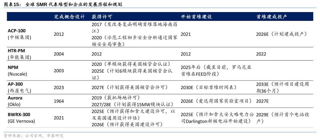 我们认为SMR在欧美尤其是美国的新增核电装机中会占据更高份额。如前文所讨论的,一方面过去二十年美国大型核电站建设施工经验断档,美国新建核电或通过SMR路线提升工程可行性和可控性;另一方面SMR技术规模更可调、选址更灵活、换料更低频等特征匹配AI数据中心用电需求,包括Google、Amazon等云服务商纷纷与SMR企业签署2030-35年间的战略供电协议,此外甲骨文也表达了利用SMR为其数据中心供电的意向。美国核能监管委员会(NRC)于2020年批准了首个SMR设计(来自NuScale),另有来自Westinghouse、GE Vernova、Duke等公司的7个项目/设计正在申请流程中。我们统计多个SMR设计目标在2025-27年附近取得NRC设计认证,并于2027-2030年前后实现首堆投产。