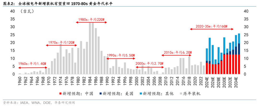 多因素推动全球核能复兴。核能是目前人类掌握的单位能量密度最高的能源形式,同时也是清洁零碳排放能源。上一轮全球核电开发大周期伴随石油危机发生,在1970-80年代的20年间全球实现了年均17GW的核电新增装机。1990年代后随能源危机缓和以及核电事故出现,全球新增装机回落至约5GW/年水平。2020年代以来,伴随全球能源格局变化,我们预计全球正迎来新一轮核电复兴周期。一方面俄乌冲突引发的油气能源安全议题正带动美欧国家核能政策复兴,另一方面高波动新能源渗透带来的电力系统压力使得对核电等可控装机的需求正在增强,此外海外再工业化和AI应用兴起有望拉动电源增量需求。核能的清洁、稳定、安全特性正在得到全球能源规划者的重新认知,COP28大会上由美国牵头二十余国家发起的2050年三倍核能宣言,以及G7国家宣布2035年退煤,国际社会开始认可核能对实现气候目标的重要性,国内核电审批节奏亦自2019年起实质性加快,我们预计本轮全球核电建设潮在长度和强度上均有望对标上一轮1970-80s高峰,2024-35年间全球核电年均新增装机有望突破18GW/年,核能行业正在经历“十年等一回”的产业机遇。