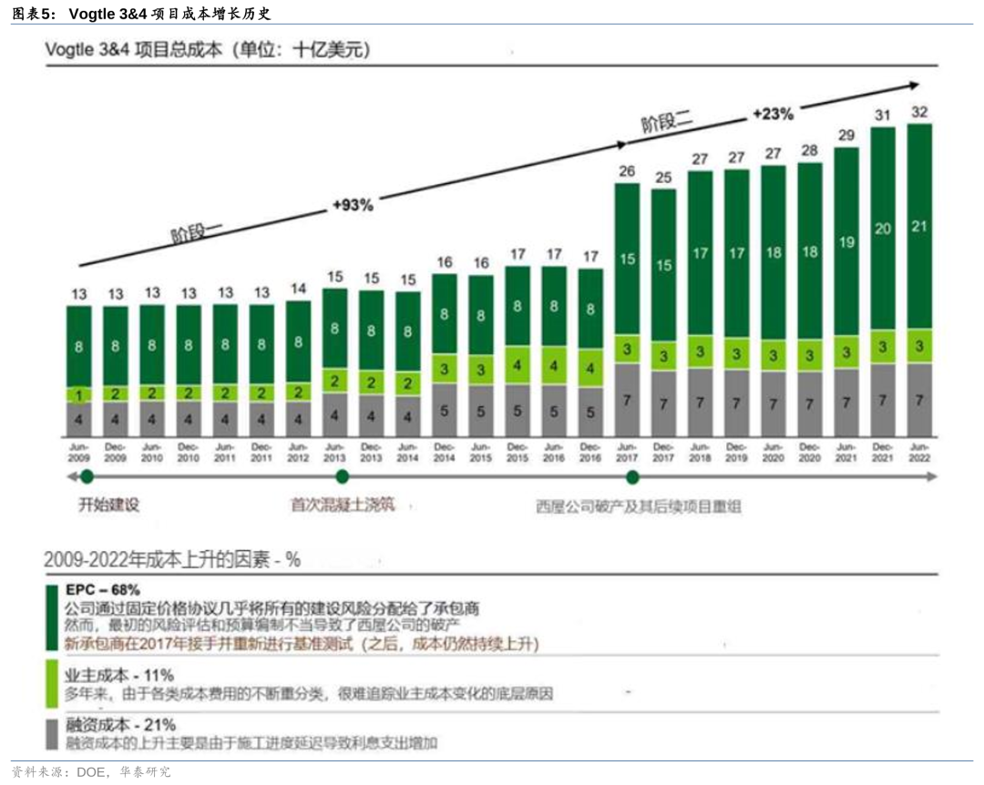 在过去20年中,美国大型核反应堆的发展碰到了严重的建设周期延长和成本超支问题。以Vogtle核电站为例,其3号和4号机组的建设多次延期,在2023和2024年才分别投运,较计划投运时间拖期7年有余,且成本超出预算约146%(其中,由于建设拖期,利息和EPC成本远超最初预算,项目最终产生利息费用占总投资造价的23.4%,不含设备的EPC成本占比高达21.2%)。2017年3月,Vogtle 3&4号机组的总承包商西屋电气公司也因无法承担超支和延误导致的财务压力而宣告破产。