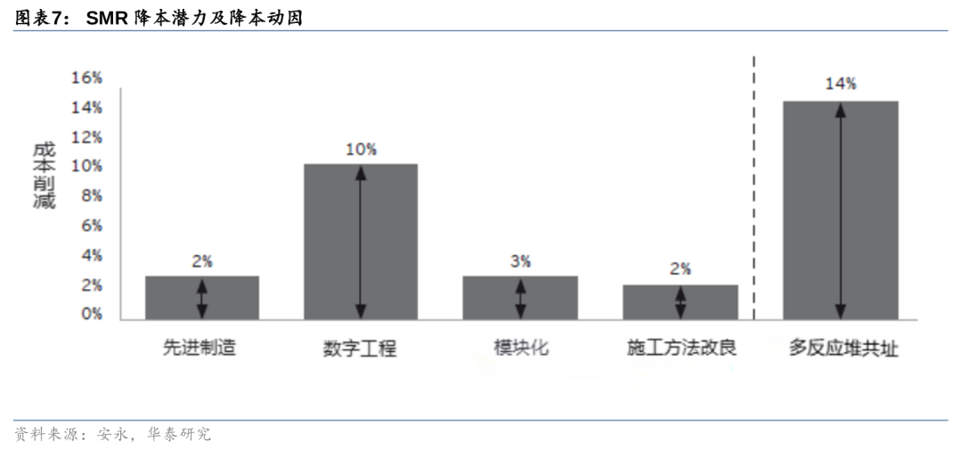 2. 在成本控制方面,美国能源部(DOE)的数据显示,SMR与大型核反应堆的平均建造成本相近,但SMR的成本预测区间更为集中,这表明SMR在成本方面具有更高可控性。此外,模块化技术能够为不同规模的核反应堆带来成本效益,特别是在SMR中,这种效益更为明显。麻省理工学者强调,模块化技术能够使基于SMR的小型模块化反应堆的造价降低约2300美元/千瓦,而对于大型反应堆则仅能降低约900美元/千瓦。这些成本的减少主要得益于建设周期的缩短和利息支出等间接费用的降低。安永的分析报告进一步预测,通过一些技术手段SMR成本仍有 20%-32%的理论下降空间,降本潜力主要来自多反应堆共址能够分摊固定成本和减少间接成本(但是大型反应堆的规模和安全要求限制了这种共址的实施),同时,建筑信息模型(BIM)技术可以通过对工厂进行数字建模来规避潜在风险(SMR的技术成熟度相对较低,相比成熟的大型核反应堆,BIM技术的潜力更容易被挖掘)。因此,SMR在建设周期和成本控制方面的优势,使其展现出了广阔的发展前景。