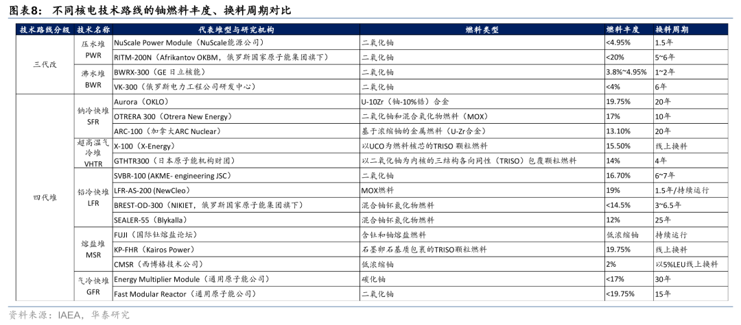 传统三代堆用U235丰度为3~5%的低浓缩铀燃料,基本需要每一年~一年半大修换料一次,大修需要停堆1个月。而基于四代核电技术的SMR可通过使用高丰度低浓缩铀燃料(High-assay low-enriched uranium,简称HALEU)从而缩小反应堆体积、延长换料周期、降低停堆大修频率、提升整体运营效率,从而更好满足数据中心连续不间断供电的需求。例如,OKLO的Aurora钠冷快堆反应堆,使用19.75%的高丰度燃料,可以实现最高20年的超长换料周期。这种长周期运行特性对于数据中心尤为重要,因为它们无法承受频繁的停堆换料导致的电力供应中断。亚马逊和谷歌等科技巨头已经认识到SMR在数据中心供电中的潜力,分别与X-energy(X-100:15.5%燃料丰度及线上换料模式)和Kairos Power(KP-FHR:19.75%燃料丰度和线上换料模式)签署了供电协议,体现出SMR更高燃料浓度、更低换料频率的运营特性对数据中心企业的吸引力。